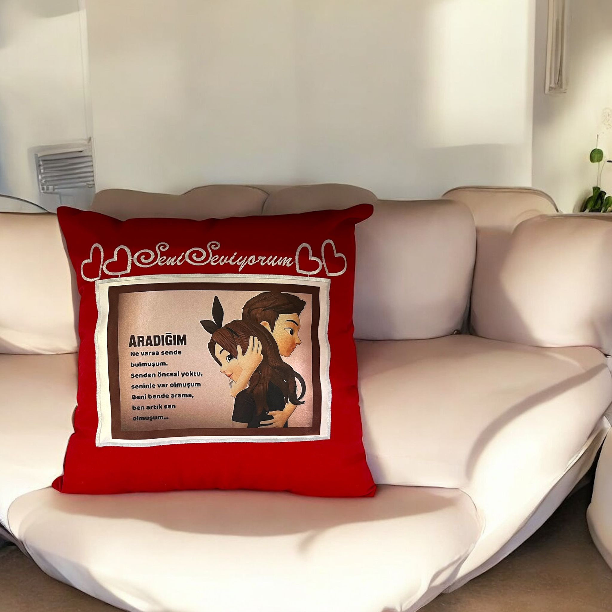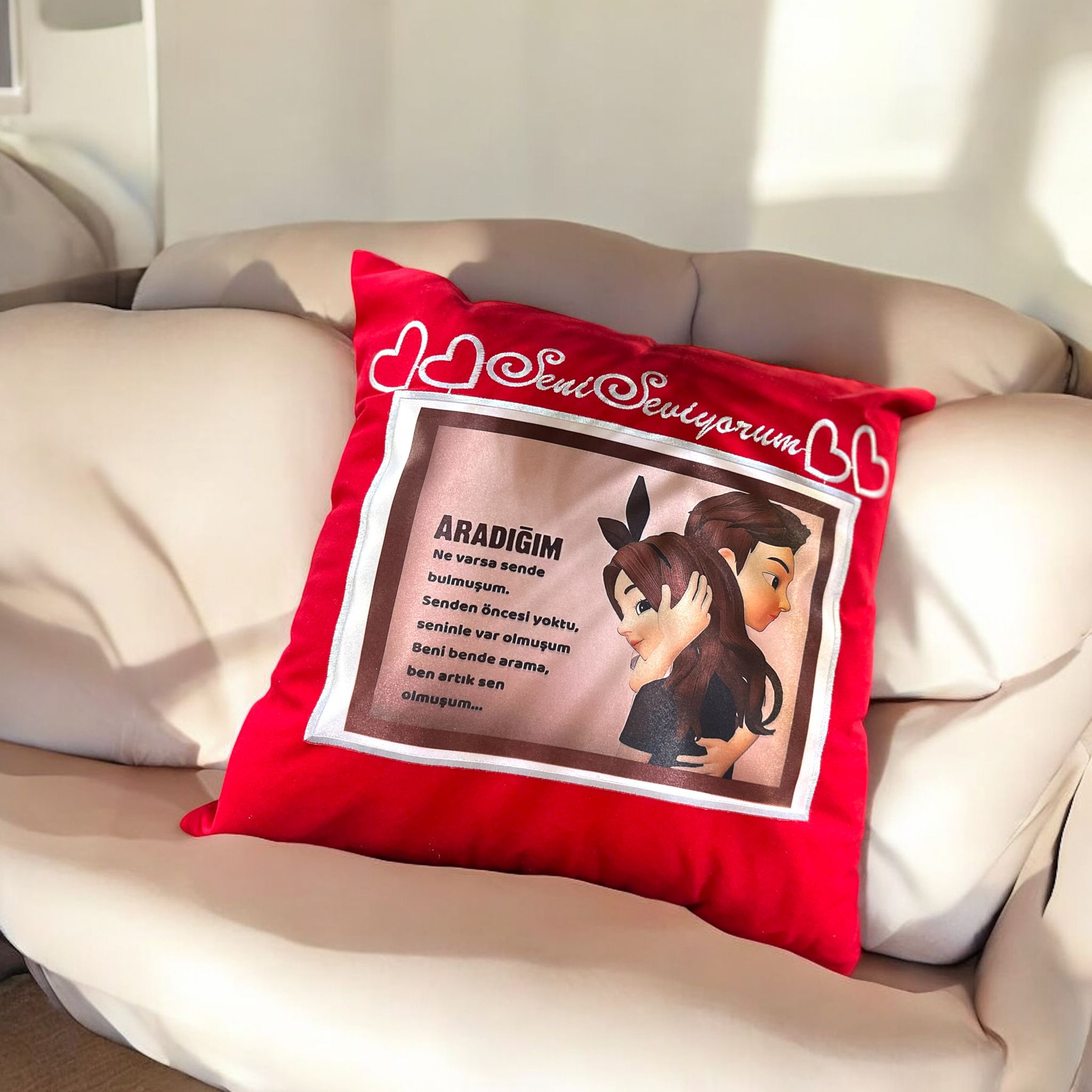 SENİ SEVİYORUM SÖZLÜ MESAJLI 40X40 SÜBLÜMASYON BASKILI YIKANABİLİR KİŞİYE ÖZEL YASTIK, sevdiklerinize duygusal bir hediye vermek istediğinizde tercih edebileceğiniz mükemmel bir seçimdir. Sevginizi en özel ve dokunaklı bir şekilde ifade etmenize olanak sağlayan bu yastık, özel tasarımı ve yüksek kalitesi ile sevdiklerinizin kalbini ısıtacak.