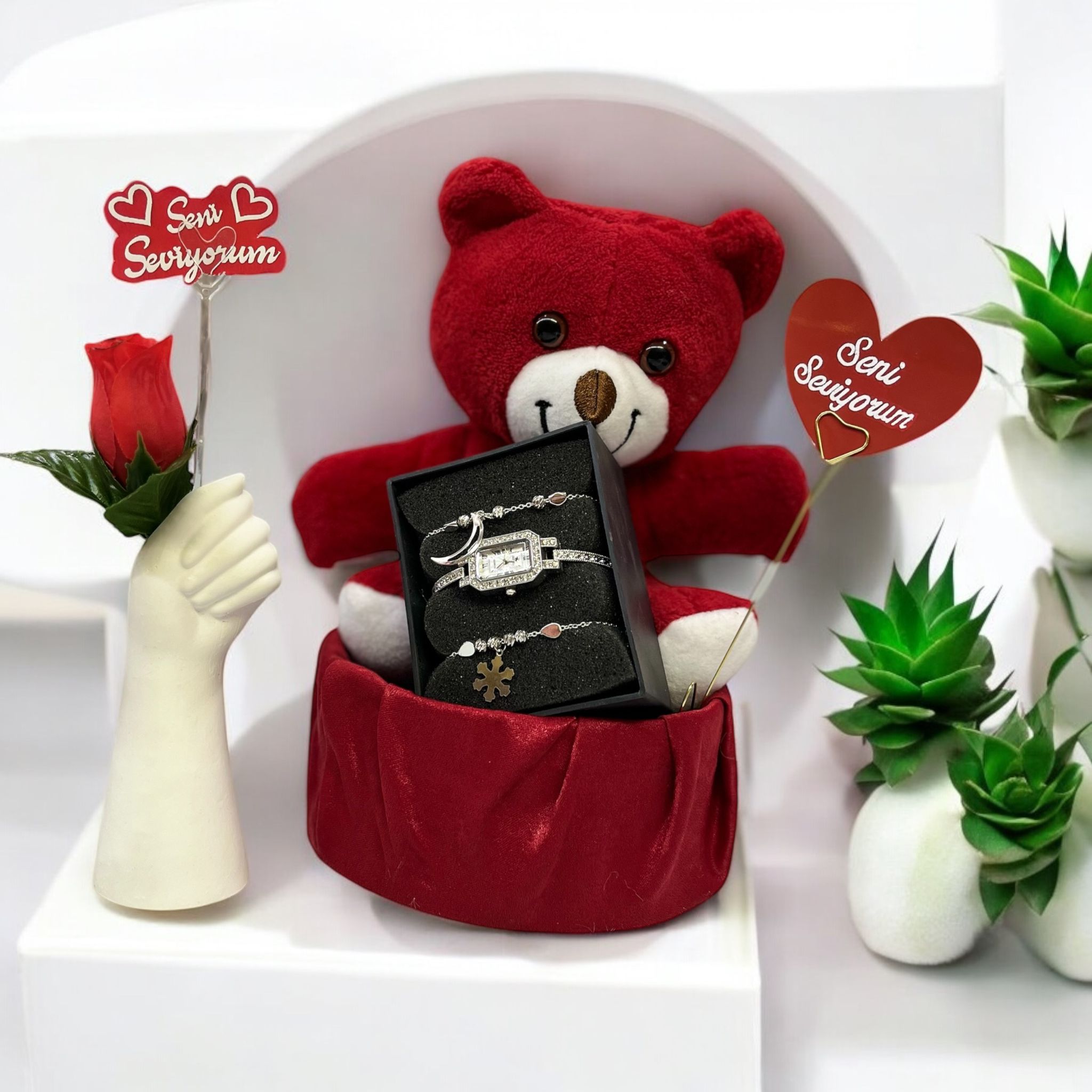Bunun yanı sıra, sepetimizin içinde sevgilinizin tarzına uygun bir takı seti de bulunuyor. Hem kadınlar hem de erkekler için özel olarak tasarlanmış ve birbirinden güzel takıların yer aldığı bu set, sevgilinize verebileceğiniz en romantik ve özel hediyelerden biri olacak.